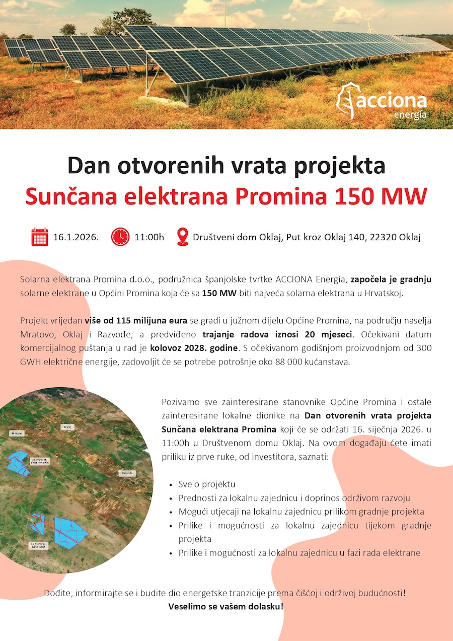 Zbog izvođenja radova „Izvanrednog održavanja raskrižja županijske ceste ŽC 6055 i nerazvrstane ceste NC 238“ (Rotor Oklaj) zatvara se za sav promet dionica kroz mjesto Oklaj u dužini od 300 m u razdoblju od 9.12.2025. do 13.12.2025. Promet će se odvijati obilazno.